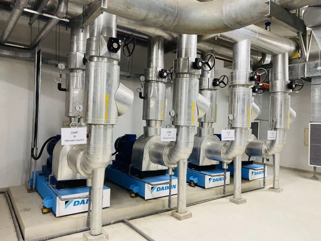 – Bộ phận Cụm máy lạnh chiller làm nhiệm vụ giải nhiệt gió.